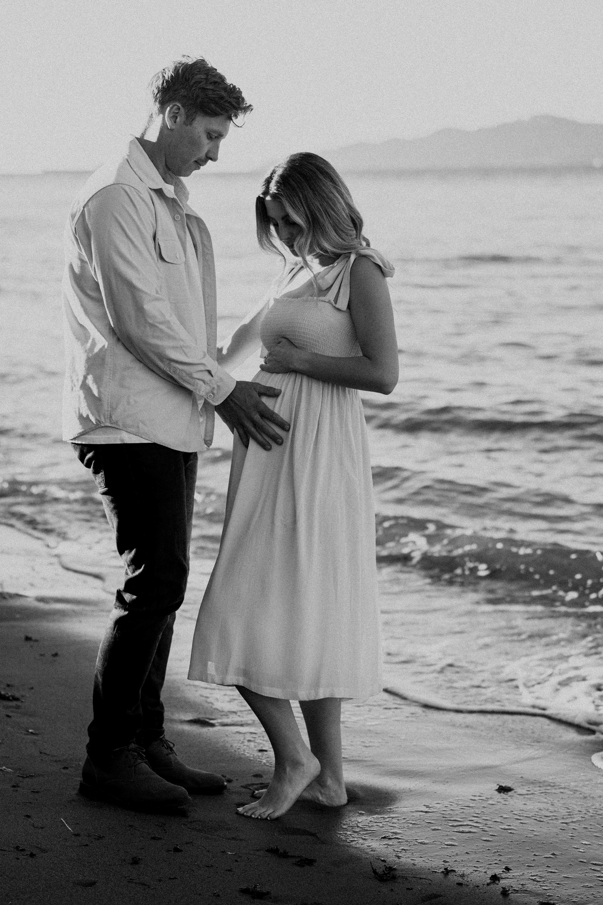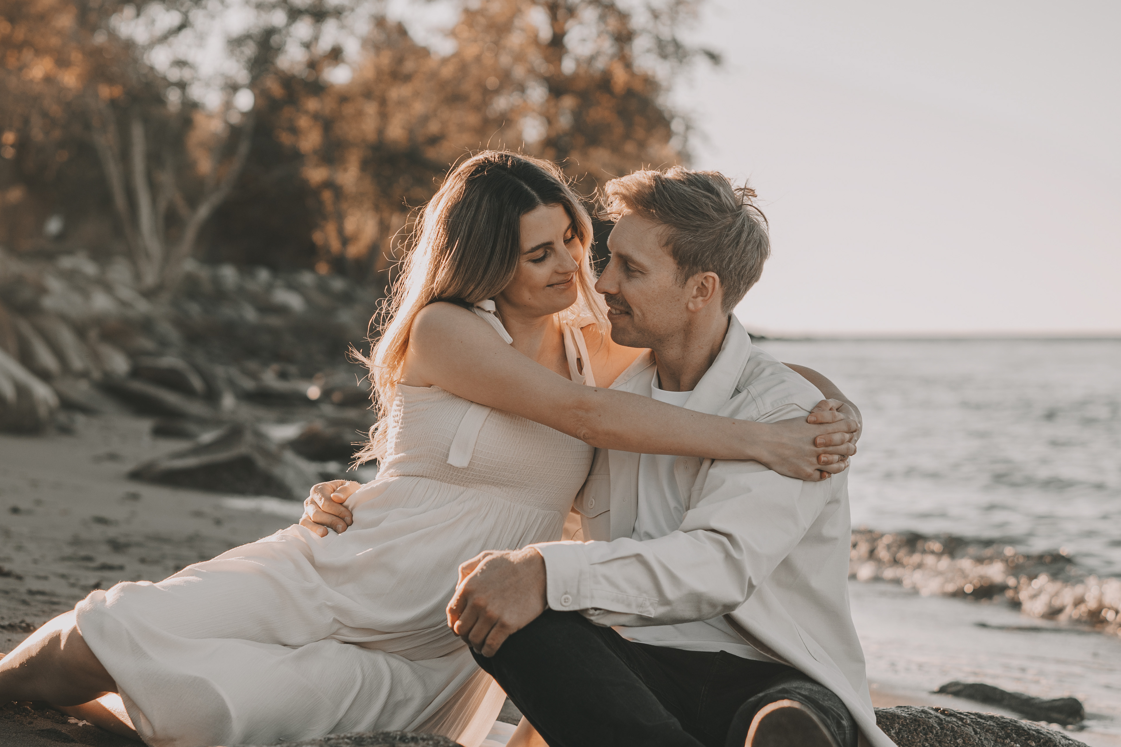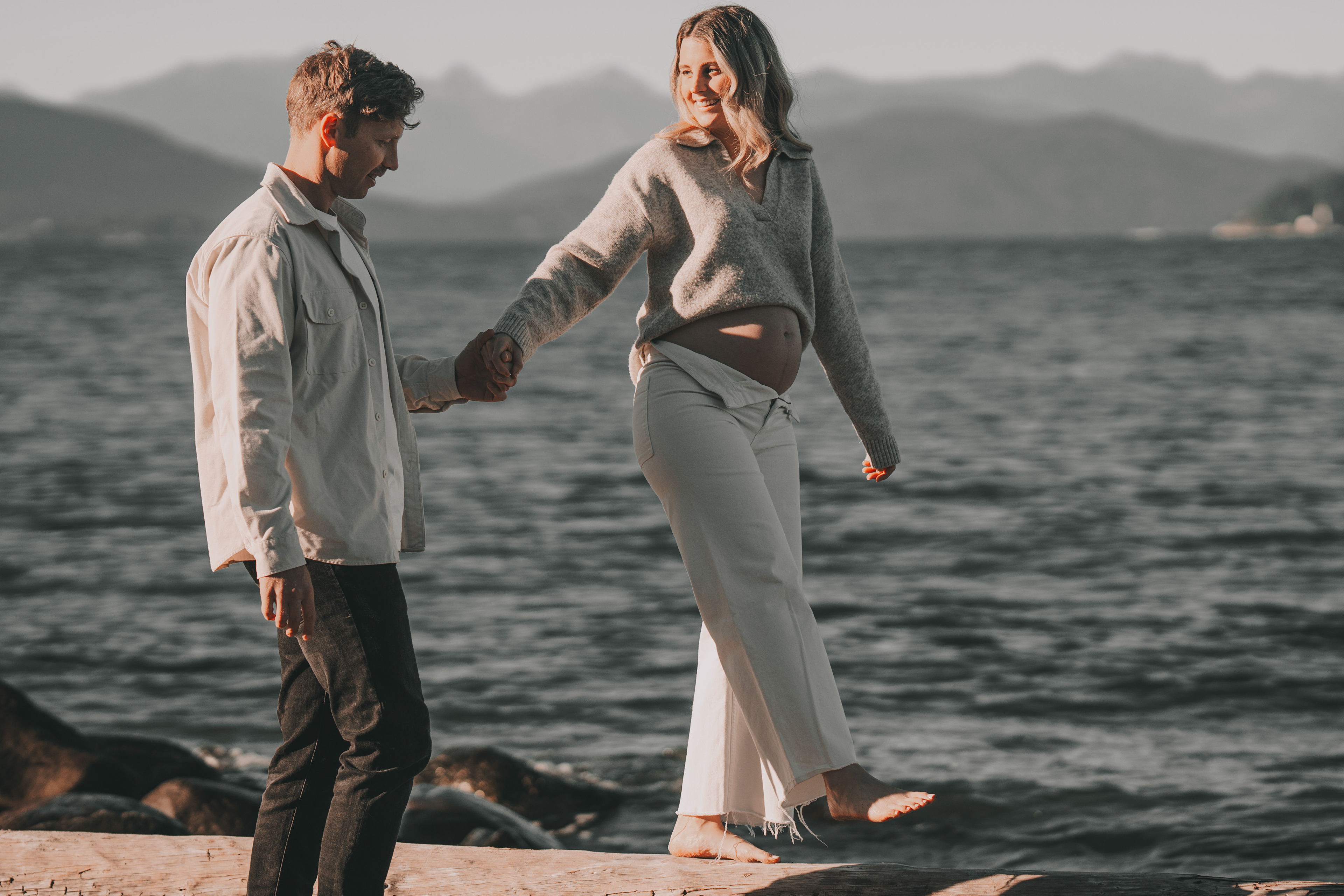 Sam and Lizz are expecting their first baby, and we went to a quiet stretch of Spanish Banks in Vancouver to capture the moment. The light was perfect during golden hour, with the sun dipping low over the water. They laughed, wandered barefoot in the sand, and took in the calm together. It was a simple and beautiful evening that felt completely true to them, full of warmth, anticipation, and love.